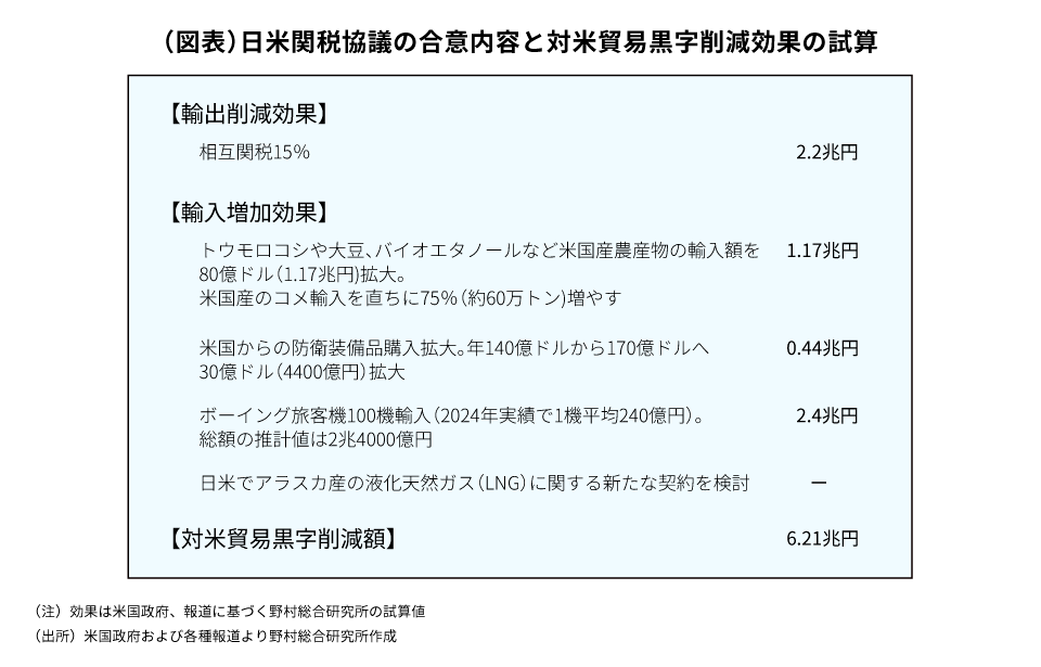 以上を合計すると、今回の合意は対米貿易黒字を6.2兆円程度削減し、それは2024年の対米貿易黒字額8.6兆円の約7割となる計算です(図表)。それでもなお、貿易黒字の解消には至りません。