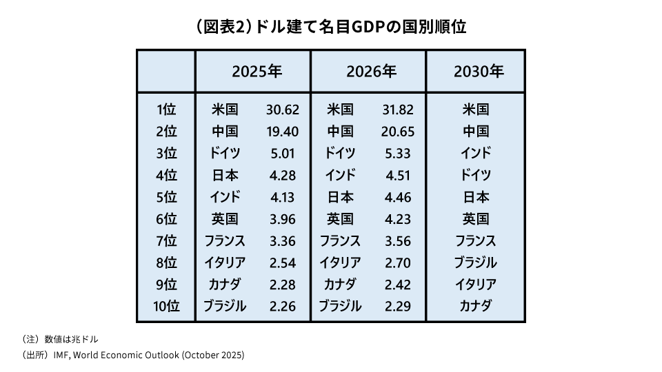 IMF(国際通貨基金)によると、2030年時点でも米国の経済規模は世界一の地位を維持する見通しです(図表2)。経済規模で見た米国の優位は、事実上の基軸通貨の地位を今後も支え続けるように見えます。