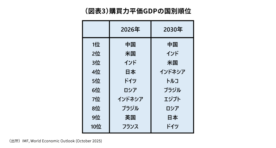 さらに、2030年時点の国別のGDP(購買力平価ベース)を見ると、米国はインドにも抜かれて世界第3位の経済規模にまで後退する見通しです。上位10位までで、先進国は3位の米国、9位の日本、10位のドイツと3か国にとどまり、それ以外は全て新興国が占めます(図表3)。