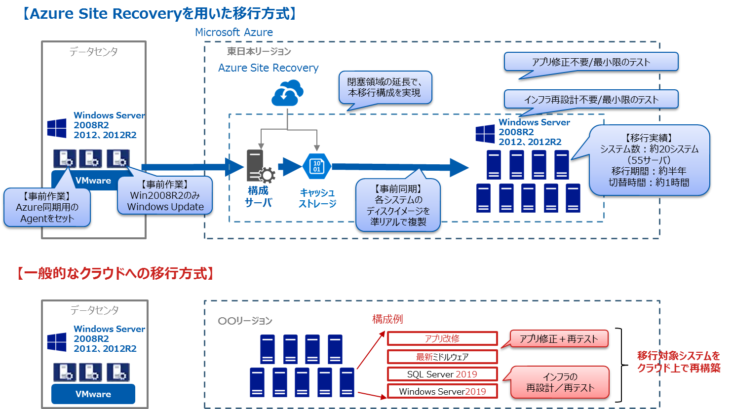 Azure Site Recoveryを用いることで、一般的なクラウド移行のように、OSのバージョンアップや、既存のアプリケーション修正を行うことなく、Microsoft Azureへの移行を低コスト・短期間で実現しました。