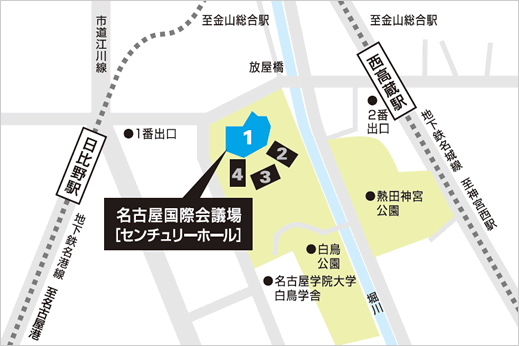 会場地図 会場 名古屋国際会議場[センチュリーホール] 〒456-0036 名古屋市熱田区熱田西町1-1 TEL : 052-683-7711(代表) 主な交通機関 [地下鉄] 名城線: 西高蔵駅から徒歩5分 名港線: 日比野駅から徒歩5分 地図 このページを印刷する 閉じる