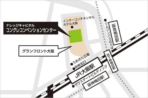 JR「大阪駅」中央北口にあります中央北口エスカレーターまたはエレベーターを使い、2階(グランフロント大阪方向)へお上がりください。2階に到着されましたら、タワーA、タワーBを通り、ナレッジキャピタル地下2Fまでお越しください。