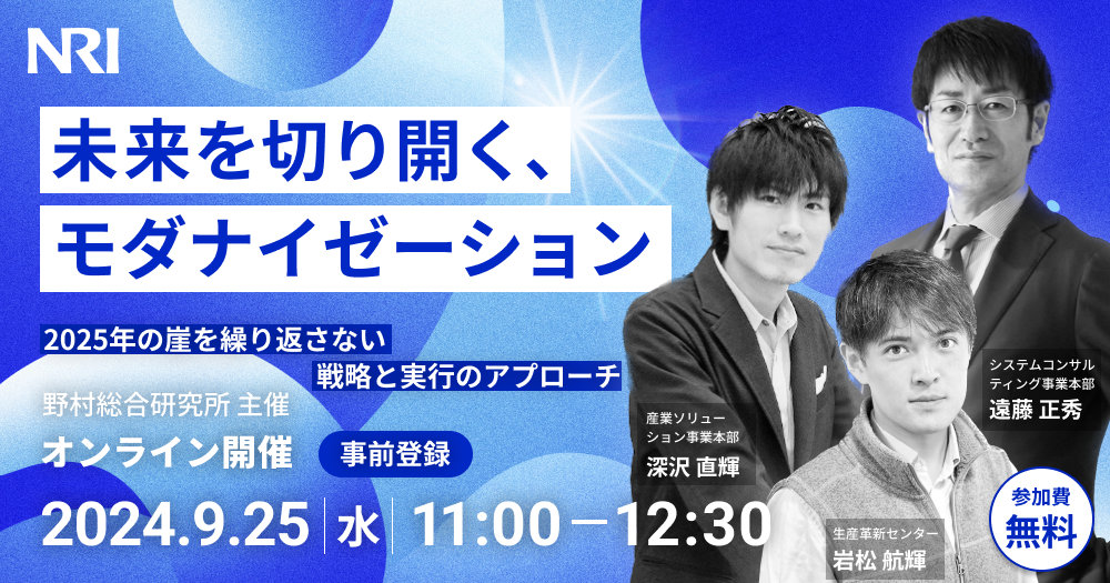 本ウェビナーではNRIのコンサルタントが、レガシーシステム問題が繰り返される背景、壁を乗り越えるための経営的・技術的アプローチ、モダナイゼーションの成功事例を解説します。