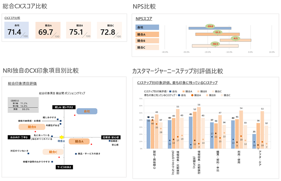 株式会社野村総合研究所(本社:東京都千代田区、代表取締役会長 兼 社長:此本 臣吾、以下「NRI」)は、企業のCX(カスタマー・エクスペリエンス:顧客がその企業の商品・サービスに対して感じる体験的な価値)を、顧客の視点で計測・評価する「CX診断メニュー」を、2022年7月13日から提供します。「CX診断メニュー」は、B2C企業を対象に、各社のCX向上における課題を抽出し、改善に向けた最適なアプローチを提示する診断サービスです。診断対象の商品・サービスを利用する顧客へのアンケートをもとに、NRIオリジナルの指標でCXをスコアリングし、競合の商品・サービス等と比較することで、強み・弱みや、マーケットにおけるポジションを可視化し、次に取り組むべきアプローチを導出します。