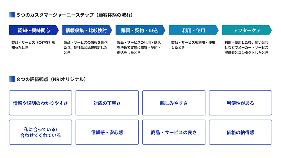 一般消費者であるアンケートパネルから自社および競合企業の実際の顧客を各社2~300人ずつ抽出し、アンケートを実施します。下記で示す5つのカスタマージャーニーステップごとに、8つの観点(NRI独自の評価観点)に沿って、各回答者の体験を振り返りながら定量的な評価と具体的なエピソードを収集します(図1)。