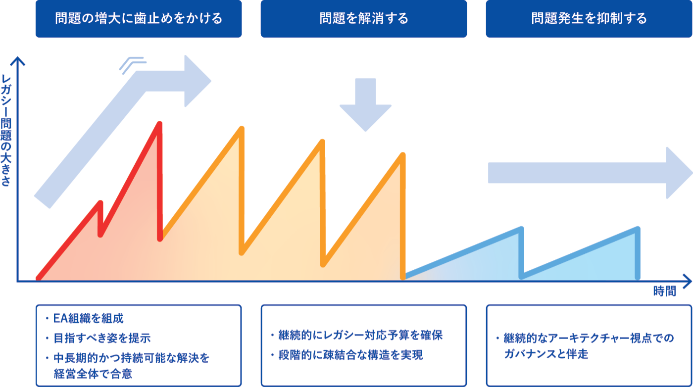 Architect、EA2)組織を組成して、現行システムの可視化、目指すグランドデザインとそれに至るまでのロードマップの提示、経営層による合意形成というステップを踏み、問題を概観することだと考えます。続いて、戦略遂行のための予算の確保、疎結合なシステム構造の実装を経て、継続的にガバナンスを利かせる仕組みを定着させ、さらなる問題発生を抑制していくことが必要です。(図1)