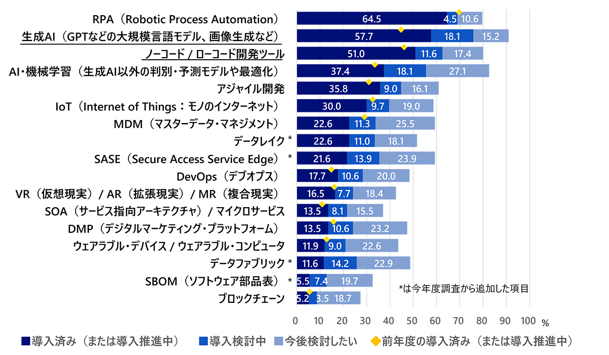 また、ソースコードを書かないか、または最小限の記述でプログラム開発を行う「ノーコード/ローコード開発」の導入率は2024年度から4.9ポイント伸びて51.0%となりました。システム開発の効率化や、専門知識がないユーザーが自ら開発を行う市民開発3における利用が拡大していると推測されます。