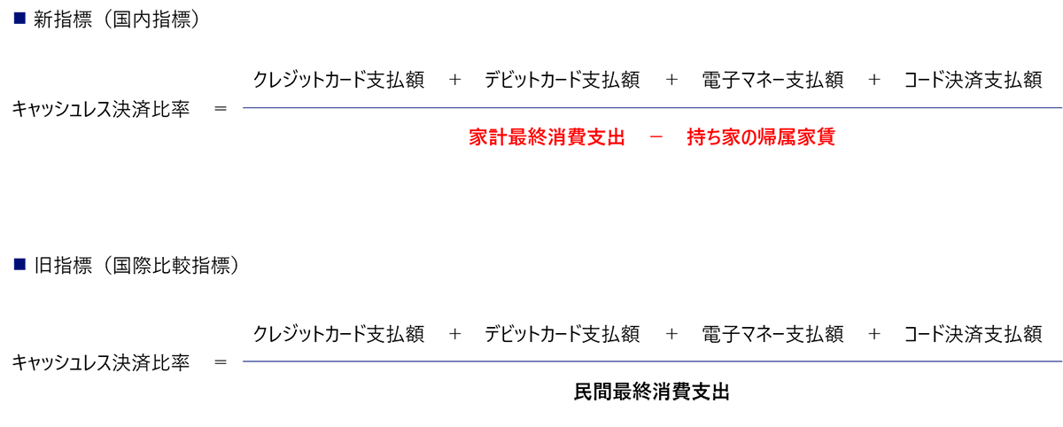 経済産業省は2025年に「キャッシュレス推進検討会」を開催し、2026年1月に公表したとりまとめの中で5キャッシュレス決済比率の新指標を新に定義しています。これまでの指標は、分母に民間最終消費支出を用いており、外国との比較には用いやすいものの、NPOの支出や、支払実態の伴わない「持ち家の帰属家賃」を含むなどの課題が指摘されていました。そこで、分母を家計最終消費支出から仮想的な量である帰属家賃を除いたものに置き換えることで、実態により即したものになりました。今後はこの二つの値を併用し、これまでの指標は「国際比較指標」とし、新しい指標は「国内指標」として、目標設定されることになりました。