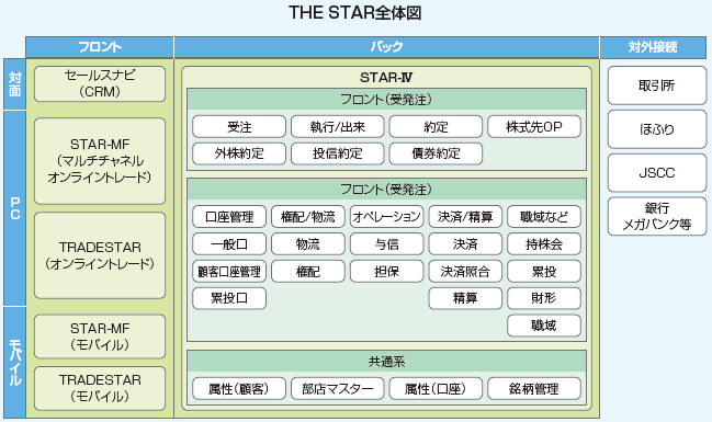NRIから提案したのは、リテール証券のバックオフィス業務をサポートする共同利用型システムである『STAR-IV』である。STAR-IVは、LINUXサーバーおよびUNIXサーバーによる分散処理、証券残高/勘定残高/取引実績/投資余力等の徹底したリアルタイム処理、コンプライアンス機能の強化、全帳票のペーパーレス化、EUC専用機能の充実、制度対応への堅実な対応、といった特徴を持つ。選考の結果、2010年7月下旬、STAR-IVの導入が決定された。