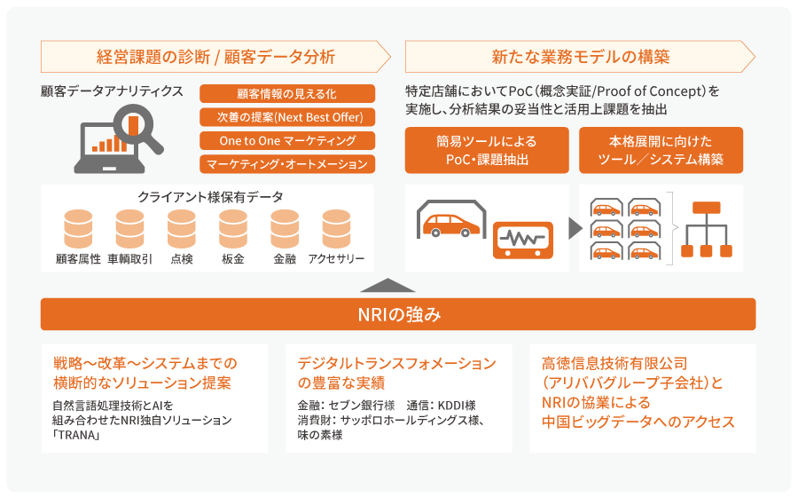 経営課題の診断でデータ活用の実効性の高い業務領域を見極めた後、NRIのデータサイエンティストが課題に応じた最適なアナリティクスを駆使し、店舗とお客様の絆作りにフィットする解析を実施します。また中国では、高徳と連携し新車販売~入庫誘致業務の構築もご提案可能です。
