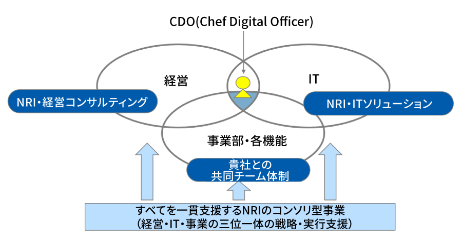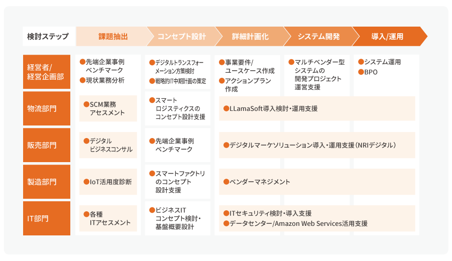NRIは中長期の事業転換戦略と、デジタルトランスフォーメーションの施策ステップ/ロードマップ具体化・実行組織設計を支援します。