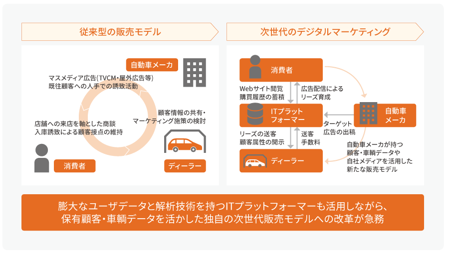 ITプラットフォーマーを活用する一方、メーカ・ディーラーの持つ顧客・車輌データを活かした独自の次世代販売モデル構築が必要です。