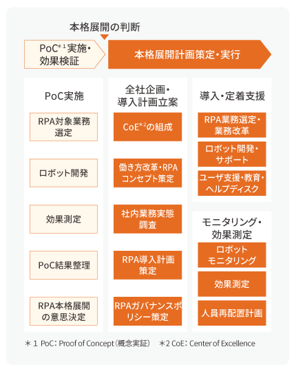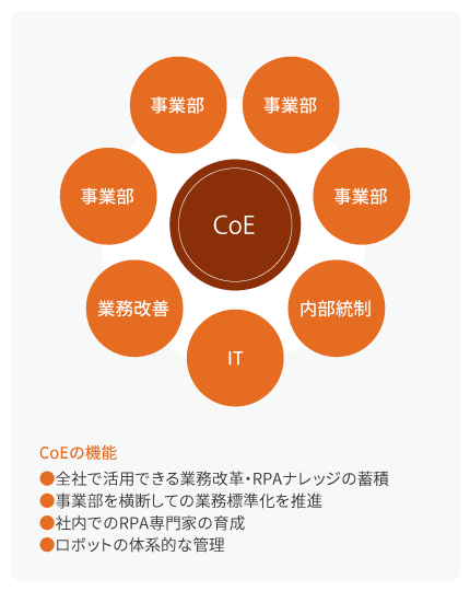(CoE)を構築したRPAツールの導入にとどまらない継続的な業務改善を提案しています。またCoEは各現場で蓄積されたRPA導入のナレッジ、組織全体で形式知として体系的に管理する狙いも持ちます。また企業固有のガバナンス事項を中央に集約して、リスクに備えることができます。これにより、企業はCoEに集約したナレッジを活用して業務改善・RPA活用の全社展開を進めることができるようになります。