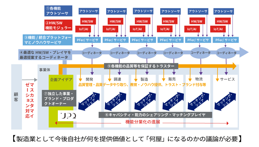 ドイツによるIndustry4.0や中国による中国製造2025をはじめ、産業のデジタル化が世界中で大きく始まっています。開発から製造・販売を自社で担ってきた製造業のあり方が、デジタル技術の進展で大きく変わろうとしています。例えば工場・ラインの設計・調達・据付までをフルターンキーで担うラインビルダや、開発・製造・サービス等の各機能をソフト/IoTでデータ統合しサービスを提供するプラットフォーマー(PFer)、PFerに自社ノウハウを提供するサービサー等新たな価値提供者が台頭しています。これらの機能分断の中で、個々の技術/機能自体よりも、デジタル技術を活用した製造業のビジネスモデル・価値提供のあり方が問われています。