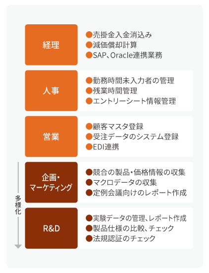 2017年に入ってからは業種業界を問わずRPA導入が進みました。これまでRPA導入の中心であった総務人事経理、バックオフィス業務だけでなく、製造業のR&D業務においても、導入事例が見られるようになりました。R&D部門では、エンジニアの開発リソースが慢性的に逼迫しています。その中で、例えばエンジニアによる実験データの転記といった定型業務でRPA導入が見込まれたり、またある会社では管理職が定型業務を行うなど、人材レベルと業務レベルがあっていないケースでのRPA導入が進んでいます。R&D部門でも定型業務をRPAで自動化できるシーンが存在しており、浮いたリソースをより付加価値の高い業務に投じることが期待されます。