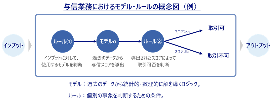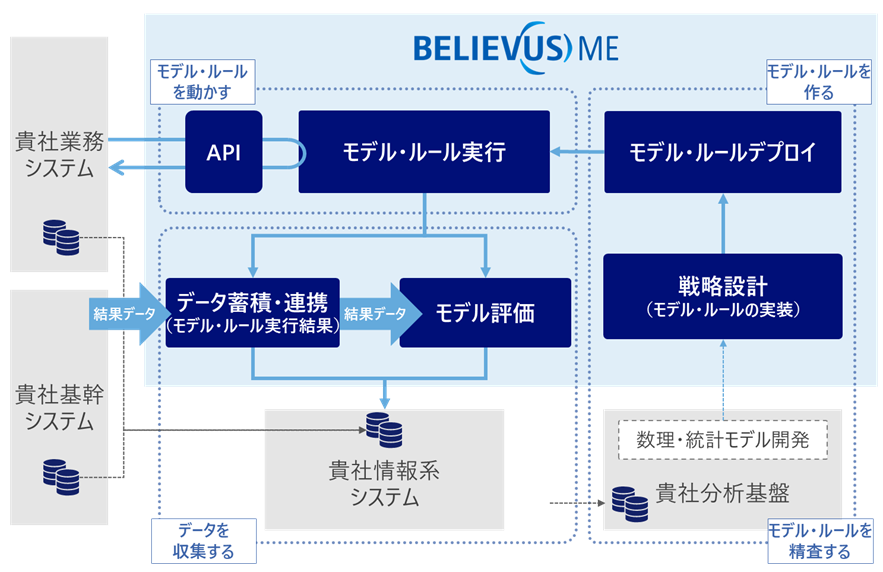 BELIEVUS/ME(ビリーバス/エムイー)は与信業務やマーケティング業務などにおいて、AIモデルやルールを組み合わせて、データに基づいた判断をするためのモデルとルールの実行基盤です。業務を実施する上で必要なルールを業務システムから切り離し、本パッケージ内でデータに基づく仮説検証を実現することで、属人的なノウハウに依存することなく継続的に精度向上を図ることができます。