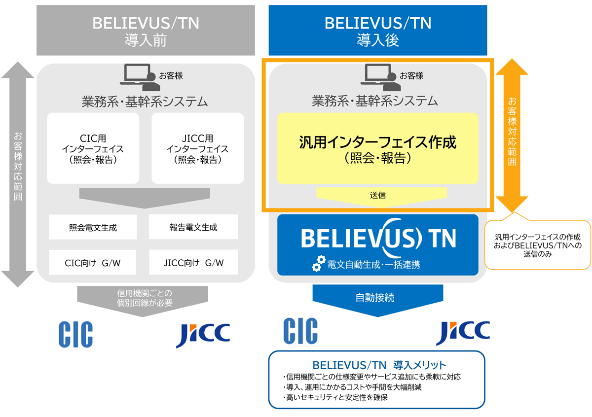 BELIEVUS/TNではこうした信用機関ごとのフォーマットをユーザーが意識することなく複数の信用機関に報告、照会ができるよう、独自フォーマットの「汎用インターフェイス」を提供しています。ユーザーは「汎用インターフェイス」向けのアプリケーションを用意すればよく、BELIEVUS/TN導入後は信用機関に合わせたアプリケーションを開発する必要はありません。