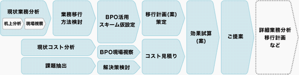 フィージビリティスタディは、BPO導入のメリットをご理解頂くことや、BPO導入の本格的な検討を行うべきかどうかの見極めをして頂くための短期間無償提供メニューです。