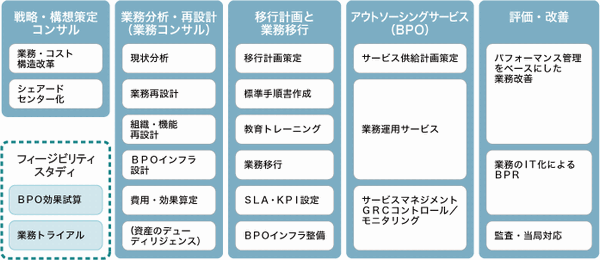 - 大規模システム・インテグレーションやシステム運用で培ったマネジメント手法を活かし、業務改革の構想策定からBPOサービス提供まで一気通貫でご支援