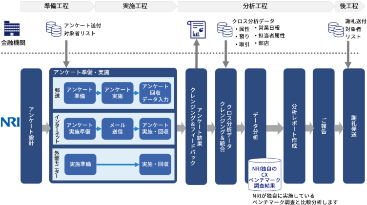 CXMM®サービスでは、このCXMM®を使って顧客アンケート調査分析全般の業務を請け負い、金融機関の顧客本位の業務運営ならびにCX戦略をご支援します。