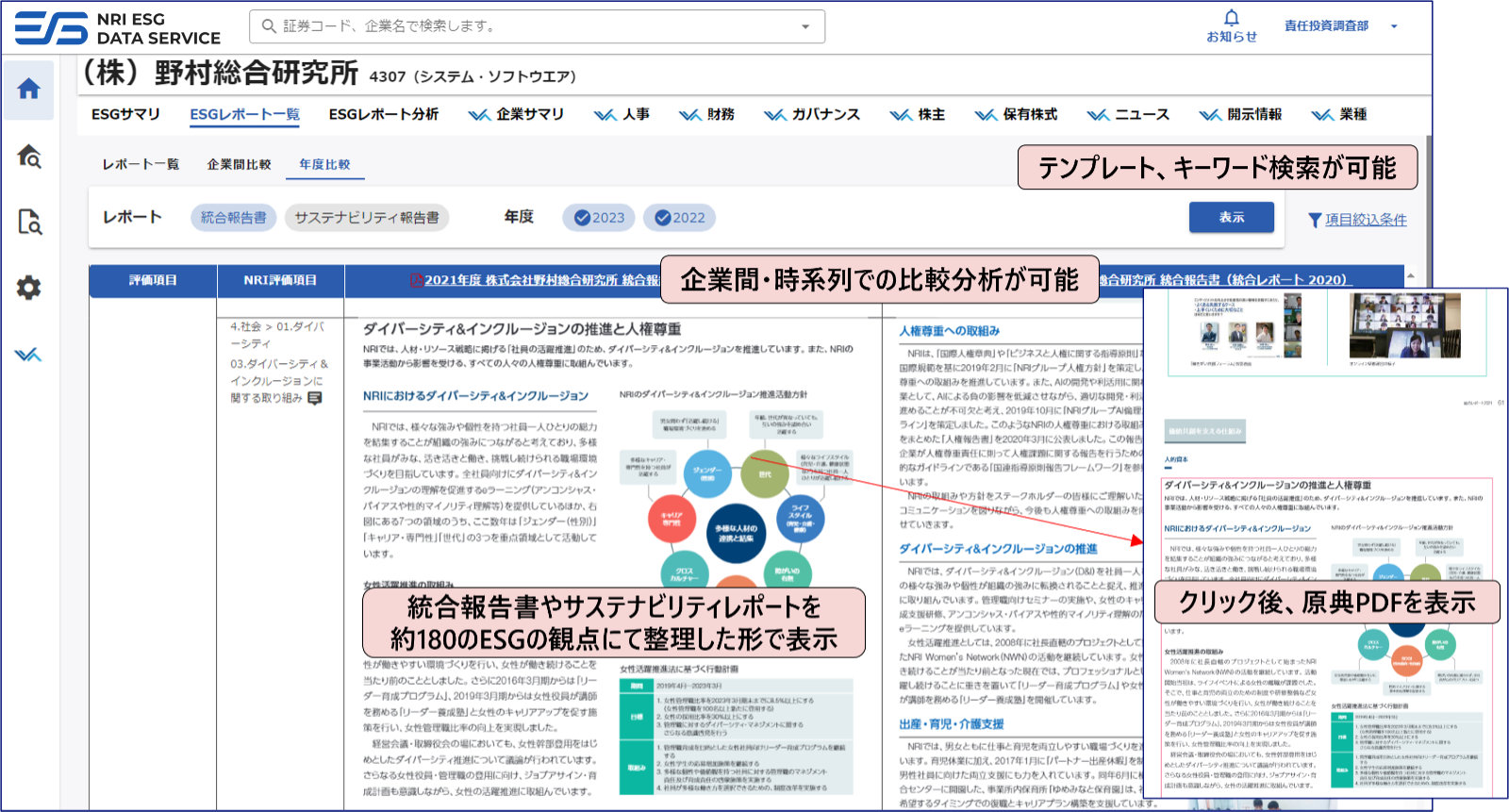 各企業が開示する統合報告書やサステナビリティレポートといった非定型のESG関連レポートを、NRIがあらかじめ用意した約180のESGの観点にて整理した形式で提供します。直観的なインターフェースによる企業間・時系列での比較分析をはじめ、カスタマイズが可能な検索テンプレート、注目するトピックに関連するキーワードによる検索、定量指標を用いた柔軟な分析機能により、ESGレポートの分析業務の効率化が可能となります。