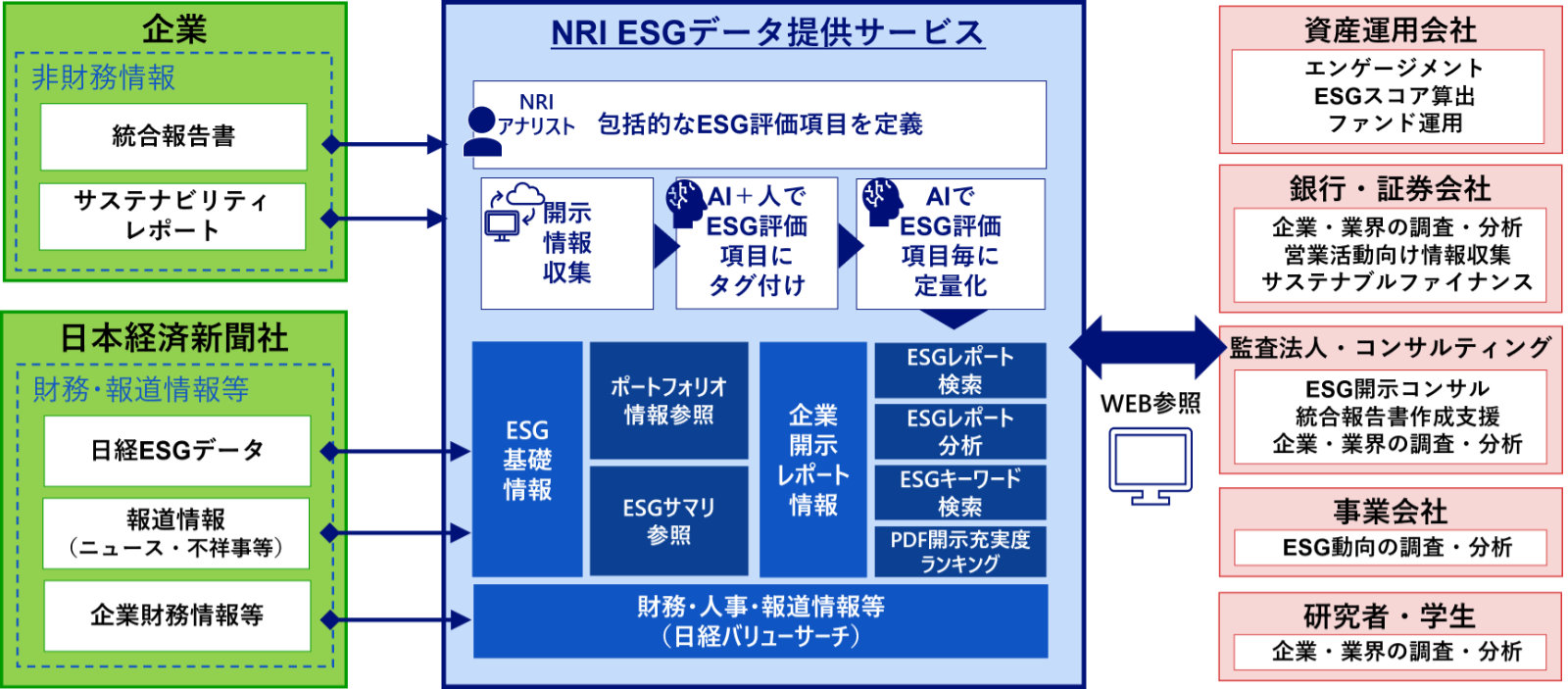 本サービスは、NRIが持つESGに関する知見や独自の人工知能(AI)技術を活用して構築したESG関連レポートの参照・分析機能と、日経の有する豊富な業界情報やESG関連データ、人事・財務等の幅広い情報を提供する「日経バリューサーチ」を組み合わせて提供します。