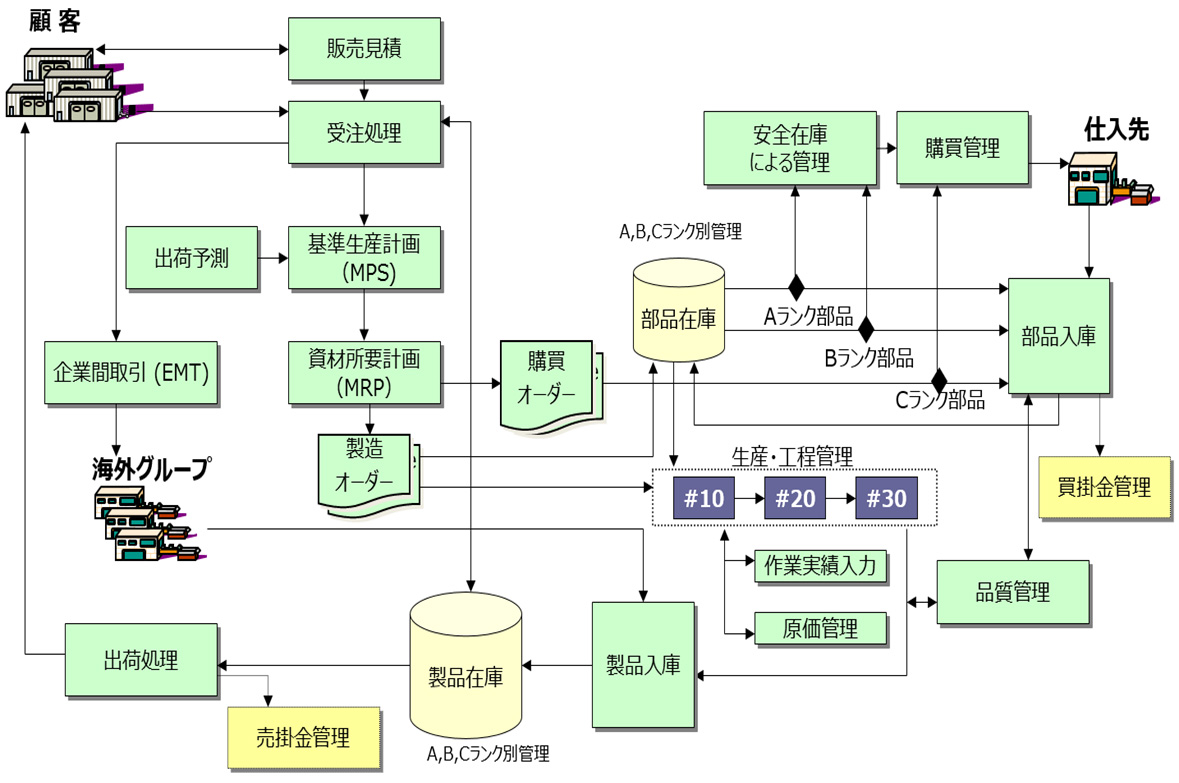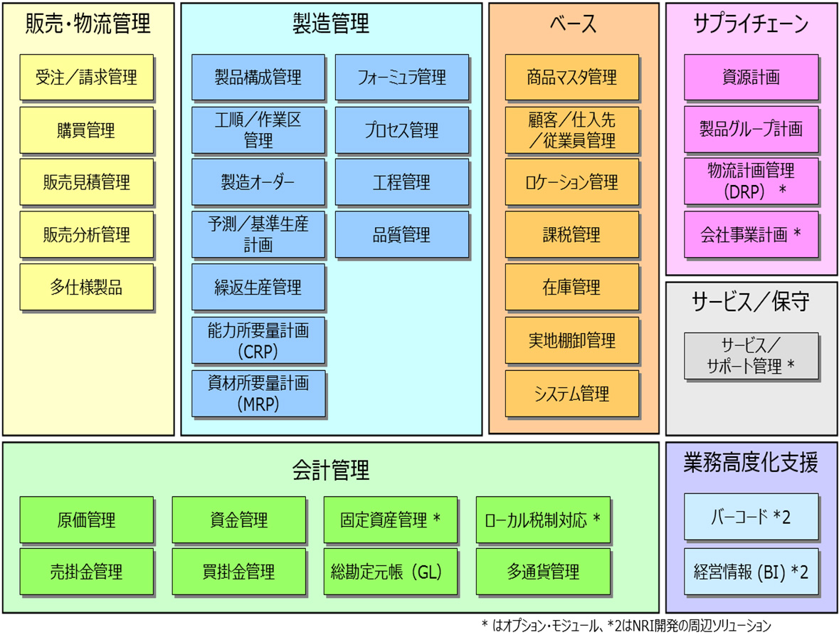 製造工程の管理(青色枠)を中心に、販売・物流(黄色枠)からサプライチェーン(桃色枠)まで一気通貫での管理が可能です。同一パッケージ内に会計関連(緑色枠)の機能も配置。