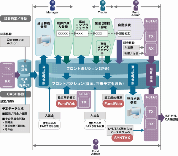 バックシステム(T-STAR/TX,RX)や設定解約情報ネットワーク(Fundweb)と自動接続することで本システムをスムーズに導入可能