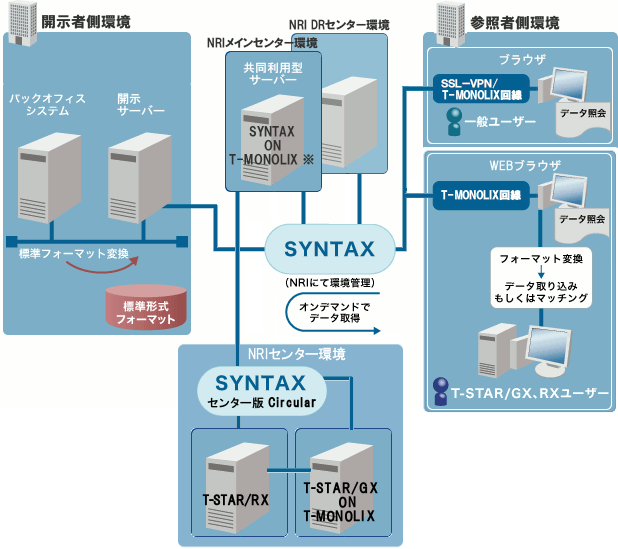 - SYNTAX on T-MONOLIXは、現在、お客様拠点に設置されている標準SYNTAX開示システムと同等の機能を持ったシステムを、複数の開示会社が共同利用できる形態に改良したうえで、弊社センターに設置し、機器運営管理を含めたサービスとしてご提供するものです。