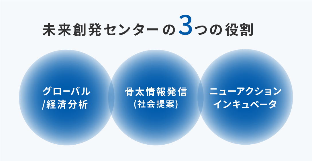 未来創発センターは、不透明さを増す日本・世界が直面する社会課題・経済課題を洞察し、科学的な判断に基づき、その処方箋を提言・発信する「未来志向型シンクタンク」を目指しています。各領域で高い専門性を有したメンバーが、社会の未来像を描きつつ、社会・経済・経営の視点から様々な課題解決策を提案していきます。