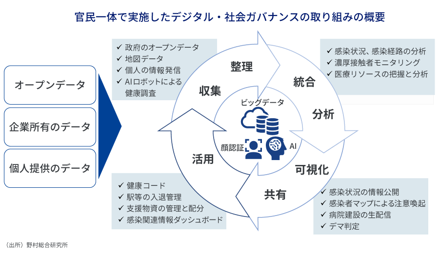 - 透明性のある情報公開の実施、感染者の追跡と感染の疑いのある人のモニタリング、デジタル証明書による市民の健康状態の可視化などにおいて、政府のオープンデータとテック企業の先端技術が結合し、中国は官民一体でデジタル・社会ガバナンスに取り組んだ。