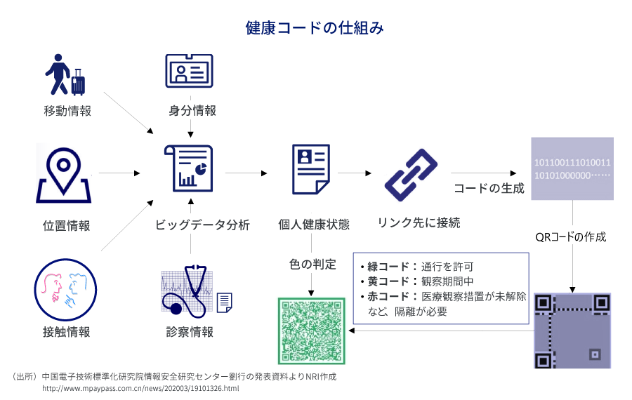 利用者がアリペイアプリで名前・ID・電話番号・詳細な健康状態および旅行情報を申告すると、感染リスクが緑、黄、赤の3段階で示される。利用者の自己申告に加え、政府が持っているデータとアリペイのビッグデータを照合し、外出可否を判定する仕組みという。健康コードは、都市間の移動、もしくは、駅や商業施設などの公共な場所への出入りの許可証として様々な場面で応用される。旧正月明けに再び開始した民族大移動の中、何回もの体温の計測や健康状態の申告の手間が省かれ、実質的にデジタル通行証の役割を果たした健康コードはスムーズな業務再開に大きく貢献したと言える。