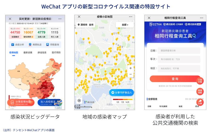 政府は、交通機関、病院などの公共部門のオープンデータを公開し、メガテック企業がそれらを地図データ、位置情報データと統合して、プラットフォーム(ソーシャルメディアのWeChat、決済アプリのアリペイ、百度地図など)経由で、感染者情報を公開することにより、透明性のある情報公開を試みた。感染者情報は、中国の国家および省レベルの衛生健康委員会からなる国家報告システム(National
