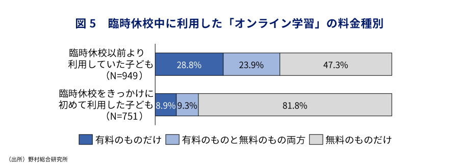 今回の臨時休校をきっかけに初めて「オンライン学習」を利用した子どもの保護者に、「これまで利用していなかった理由」を聞いたところ、最も多かったのは「必要性を感じなかった(38.5%)」で、次いで「使い始めるきっかけがなかった(36.4%)」であった(図4)。また、これまで関心がなかったが今回の臨時休校をきっかけに初めて利用した子どもの多く(81.8%)が、「無料のものだけ」を利用した(図5)。