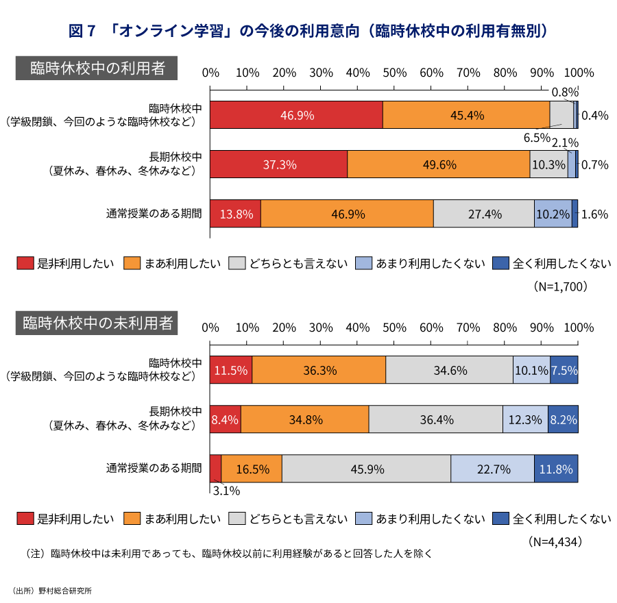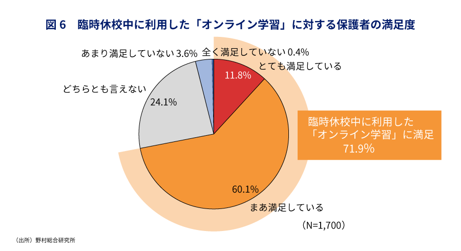 臨時休校中に「オンライン学習」を利用した子どもの保護者のうち約7割が満足。緊急時はもとより、長期休暇中や通常授業のある期間での利用意向も高い