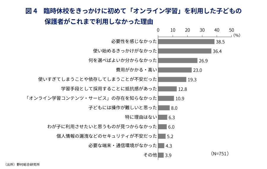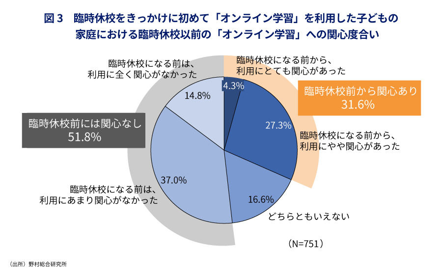 今回の臨時休校をきっかけに、初めて「オンライン学習」を利用した子どもの家庭のうち、以前は「オンライン学習」の利用に関心がなかった家庭は51.8%で、以前より「オンライン学習」の利用に関心があった家庭(31.6%)よりも多かった(図3)。今回の急な臨時休校は、もともと関心があった家庭のみならず、これまで関心がなかった家庭の子どもの「オンライン学習」の利用をも促したことがうかがえた。