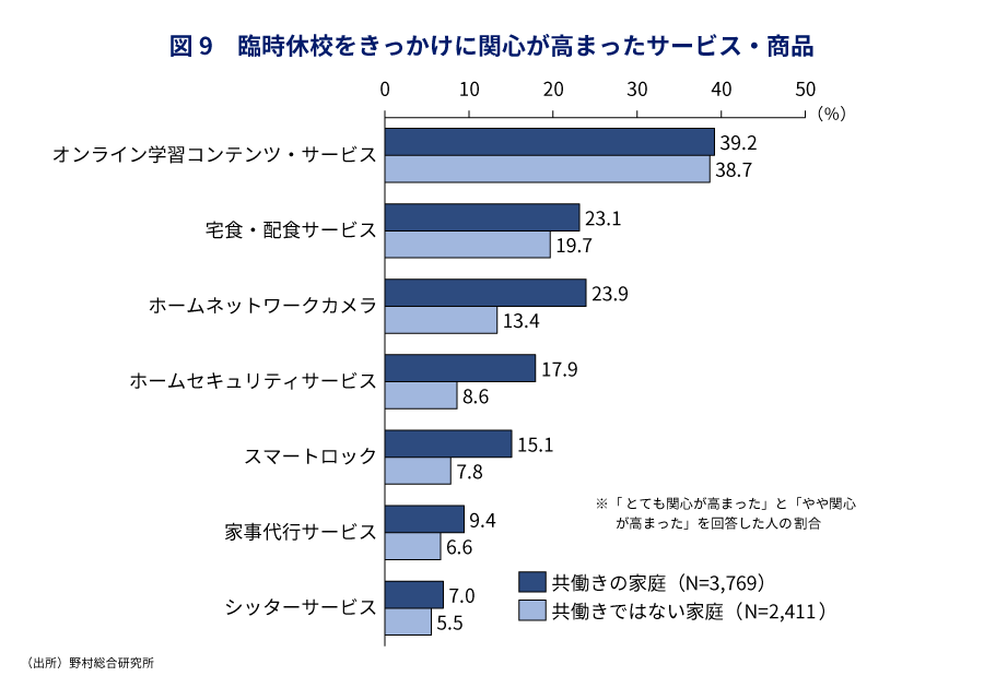 - さらに、臨時休校となった子どものいる家庭において、特に共働きの家庭を中心に、宅食・配食サービスやセキュリティ関連商品への関心が高まったことも分かった。今回の臨時休校は子育て世代の「学び方」のほか、「暮らし方」における意識の変化をもたらしたことが推察される。