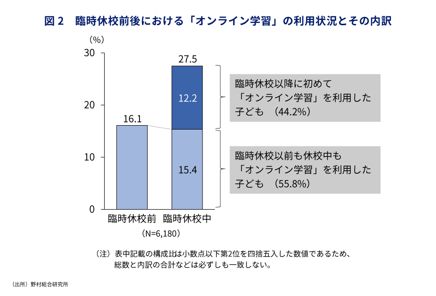 臨時休校中、小学生の27.6%(推計約177万人)が「オンライン学習」を利用。うち半数近くが臨時休校をきっかけに初めて利用