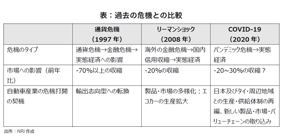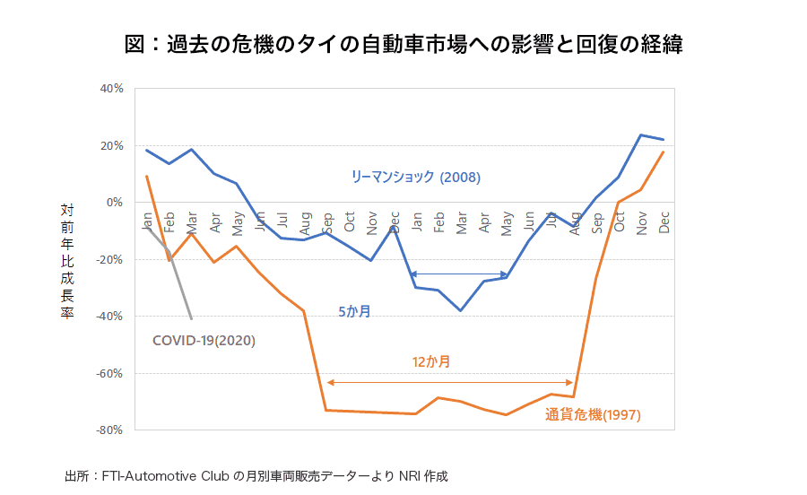 タイが震源地となった1997年の通貨危機では、国内の金融機関が破綻し、歴史的な打撃を被った。タイの経常収支の悪化からバーツ切り下げによる通貨危機、更に金融危機へと発展し、98年のGDPは二桁台のマイナス成長に至った。98年の自動車市場は前年比6割減、2年前に比べて75%の水準まで落ち込む。前年比―60%以下の自動車市場の底這い期間も12か月とリーマン危機の2倍続いた。更に、危機前の水準回復までには77か月を要した。