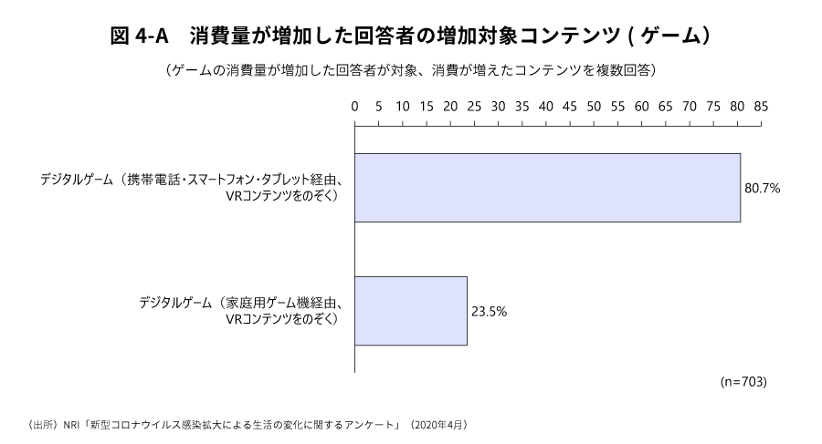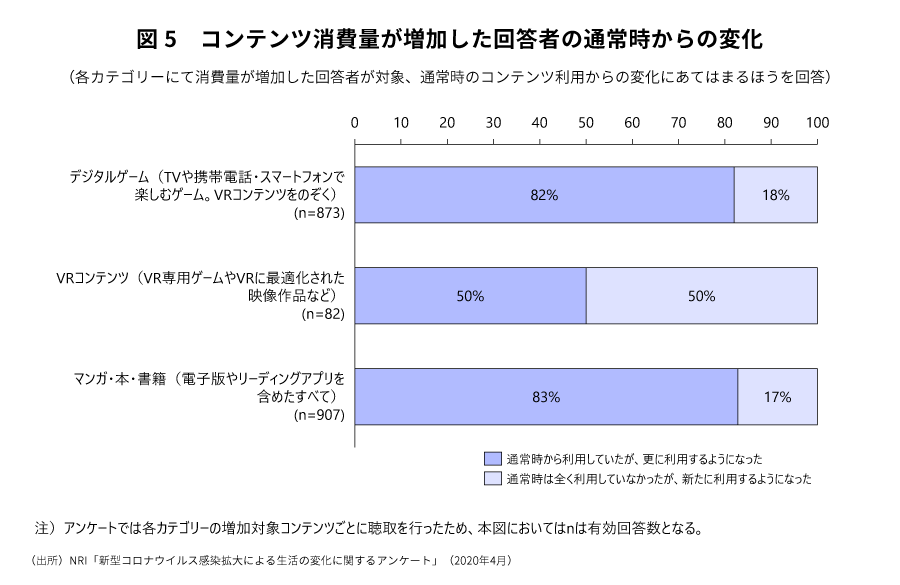 ゲームおよびマンガ・本・書籍において今回消費が増加した利用者は、それぞれ約80%が普段から利用していた従来からの利用者層で、残りの約20%は今回の騒動を機に消費するようになった利用者層である(図5)。