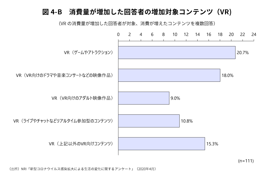 VRにおいては、これまで触れる機会を持てなかった消費者が体験や利用の機会を多く得られたことが、アンケート結果での新規利用者比率の多さからも見て取れ、ウイルス拡大収束後に新規利用者層をどれだけ定着させられるかが、市場拡大のキーポイントになる。