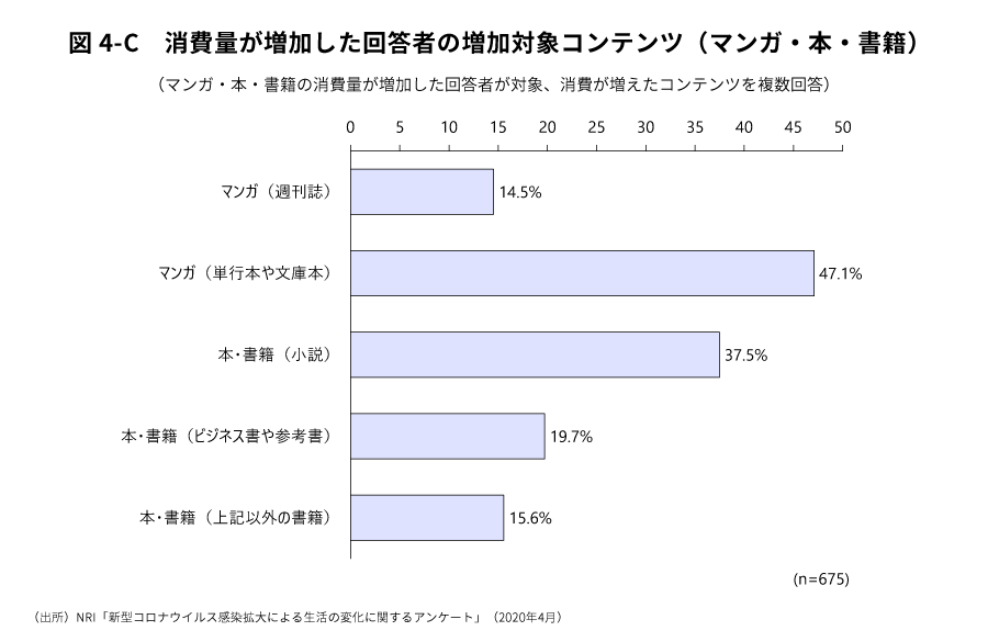 それぞれのコンテンツごとに細かくみると、ゲームでは、消費が増加した利用者のうち約80%がスマートフォンや携帯電話端末で遊べるアプリゲームによるものと回答しており、家庭用ゲーム機の消費増加は、消費が増加した利用者のうち20%程度に留まった。VRコンテンツでは、消費が増加した利用者の約20%において、ゲームやアトラクションでのVRがVRコンテンツとして最も体験・利用機会が多かった。また、VRの映像作品やライブ映像といったゲーム以外の種類でも、消費が増加した利用者の約10%から20%の間で体験・利用が増加したとする回答があった。マンガ・本・書籍では、消費が増加した利用者のうち約半数が単行本や文庫本のマンガの消費を増やし、次いで小説が約40%、ビジネス書が約20%となった(図4)。いずれのコンテンツにおいても、野村総合研究所が毎年実施している「情報通信に関するアンケート調査」の結果や各業界団体公表内容などと比較しても、通常時から利用の多いコンテンツが消費増加の対象となっており、コロナ禍における特異な分布があったわけではないとみられる。