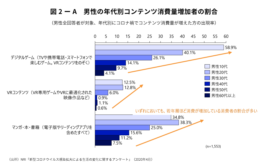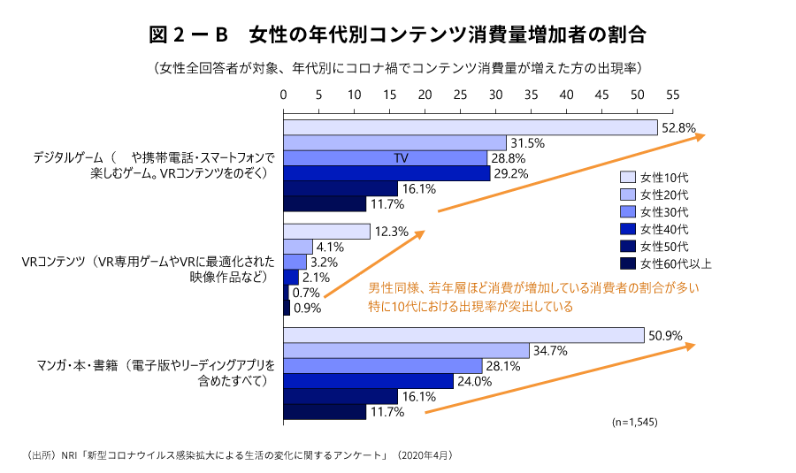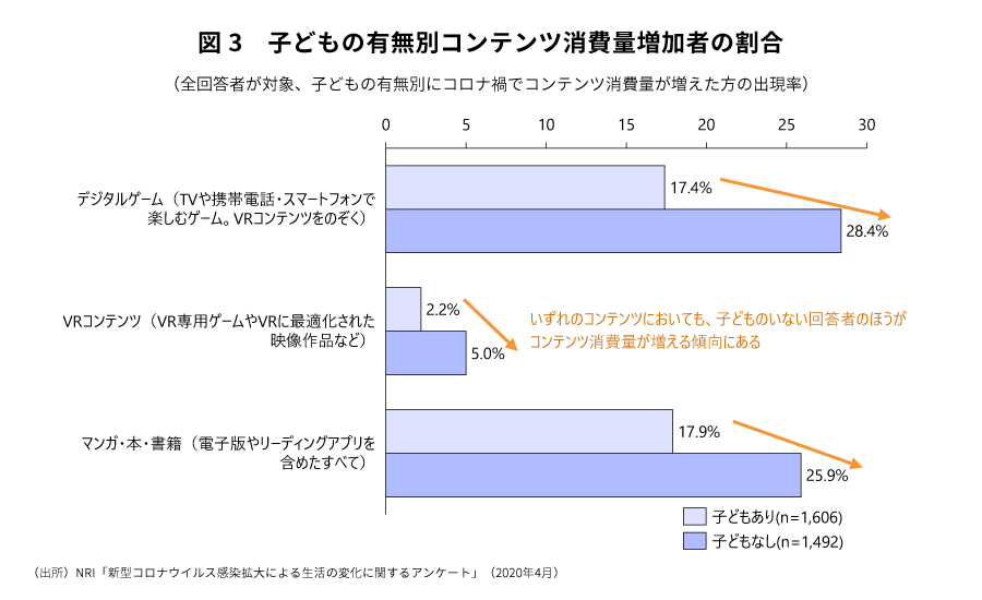 野村総合研究所は2020年4月に新型コロナウイルス感染拡大による生活の変化に関するアンケート(全体有効回答数3,098人)を実施し、「ゲーム」、「VRコンテンツ」、「マンガ・本・書籍」の3つのコンテンツカテゴリーに関して利用動向を聴取した。その結果によると、ゲームでは全体の22.7%、VRコンテンツでは全体の3.6%、マンガ・本・書籍では全体の21.8%が、新型コロナウイルス感染拡大前に比べ、各コンテンツの消費が増えていると回答した(図1)。性年代別にみれば、3つのコンテンツ全てにおいて10代および20代を筆頭に、男女とも、若い世代ほど今回を契機にコンテンツの消費を増やしていることがわかった(図2)。ただし、子どものいる世帯層は子どものいない世帯層に比べてコンテンツ消費の増加幅が少なくなっており、学校等学習施設の閉鎖により、子どもが自宅に居る時間も増えたことで、放送メディアなどとは異なり、個人で楽しむ要素の強いゲーム、VR、書籍等については消費する時間を捻出できなかった世帯層も多かったとみられる(図3)。