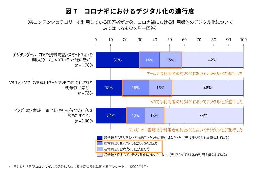 今回実施したアンケートにて、コンテンツカテゴリー(ゲーム、VR、マンガ・本・書籍)ごとにコンテンツ消費形態としてデジタル化(ゲームのダウンロード販売や、電子書籍の利用)が進んだか聴取したところ、新型コロナウイルス感染拡大によってデジタル化が進んだと答えた方が、ゲームでは29%、VRでは34%、マンガ・本・書籍では25%と、いずれのコンテンツにおいても全体の20%から30%程度に上った。デジタル化が全く進まず、ディスクや紙媒体での利用を続けていると答えた方が、ゲームでは42%、VRでは48%、マンガ・本・書籍では54%となった。ほぼ半数が依然アナログ派であることがわかったものの、短期間であるにも関わらず、ウイルス感染拡大による自粛等の影響により、デジタル化が大きく進んだことは、コンテンツ業界にとって大きな変化であるといえる。(図7)。