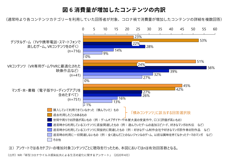 今回消費が増加した従来からのファン層に対して、ゲームとマンガ・本・書籍の両カテゴリーにおいて通常時より消費が増加したコンテンツを細かく聞いたところ、どちらにおいても過去購入していたものを消費しているケースが最も多かった。ゲームであれば手を付けたがクリアに至っていないもの、マンガ・本・書籍であれば購入したが読み始めていなかったものなど、いわゆる「積みコンテンツ」の消費が今回の騒動により最も消費されたことは、通常時の生活において、日本国内の両カテゴリーのコンテンツ利用者の余暇時間(コンテンツ消費に充てられる時間)がコンテンツの供給スピードに追い付いておらず、次第と利用から離れてしまっていたことを示している(図6)。