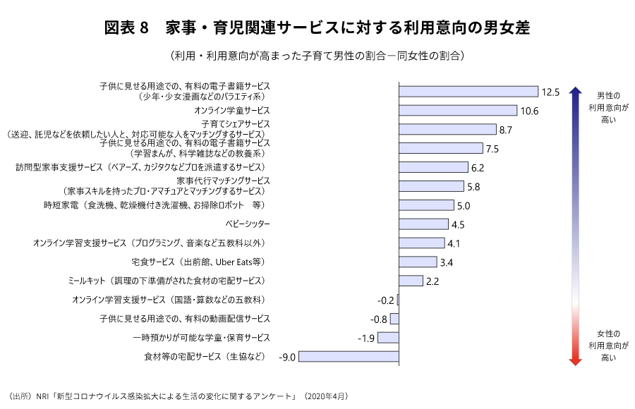 8:家事・育児関連サービスに対する利用意向の男女差)。特に高いのは有料の電子書籍サービスのほか、子育てシェアサービス、訪問型家事支援サービスのように人との接触の懸念があるものの根本的な家事負担の低減が見込めるサービスにおいて、女性と比べて利用意向が高くなっている。一方、子育て女性が、男性に比べて顕著に利用意向が高いのは、食材等の宅配サービスのみである。