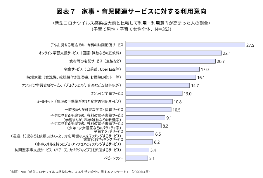 最後に、③家事・育児の負担を軽減するサービスについて、新型コロナウイルス感染拡大の影響下で利用意向が高まったものをランキング形式で示す(図表