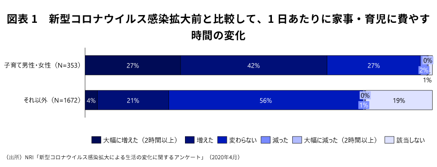 新型コロナウイルスの影響で家事・育児の時間は男性・女性ともに増えたが、負担は女性に偏りがち