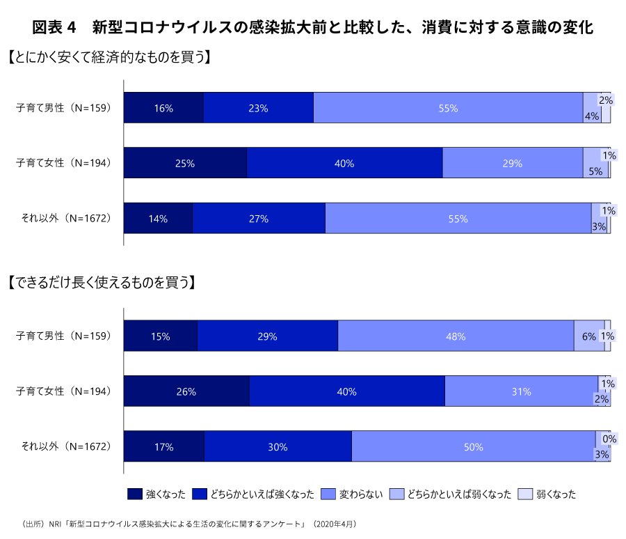 3:新型コロナウイルスの感染拡大前と比較した、家庭に対する意識の変化)。ただ、消費意識については、「とにかく安くて経済的なものを買う」、「できるだけ長く使えるものを買う」という意識が女性は7割弱が高まったと回答しているのに対し、男性は約4割に留まっており、意識に差があることが確認された(図表
