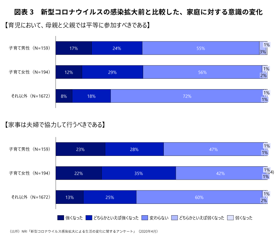 新型コロナウイルスの感染拡大により、在宅勤務や、保育園・学校の閉鎖などにより、日々の生活が大きく変化した家庭も多いだろう。野村総合研究所(NRI)では、家事・育児の負担が最も大きいと考えられる、小学生以下の子供が同居する家庭に属する男性・女性をそれぞれ「子育て男性」「子育て女性」と定義した。そのうえで、①家事・育児における負担、②家族や消費に対する意識、③家事・育児の負担を軽減するサービスへのニーズという3つの視点で、新型コロナウイルス感染拡大が子育て男性・女性にどの様な影響を与えたのか、アンケート調査を実施した。